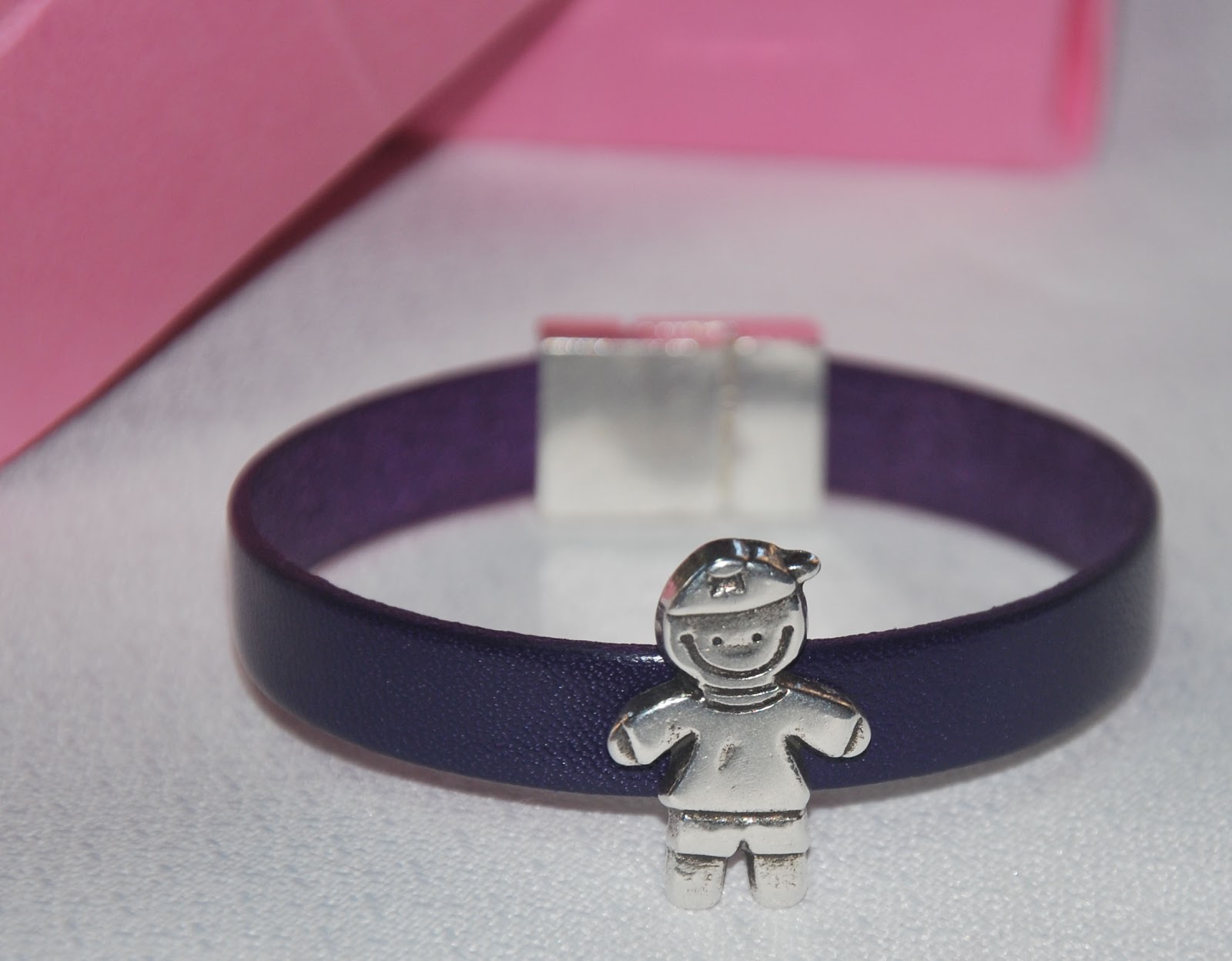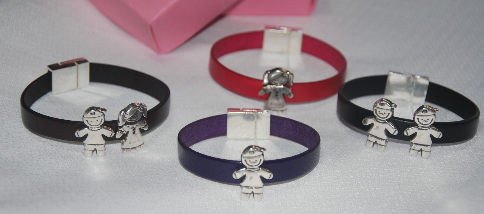 Pulseras ideales para regalar o para darte un capricho. Están realizadas en cuero (tira plana de 10 mm), con cierre de imán y con entrepiezas de niños o niñas, según elijas.