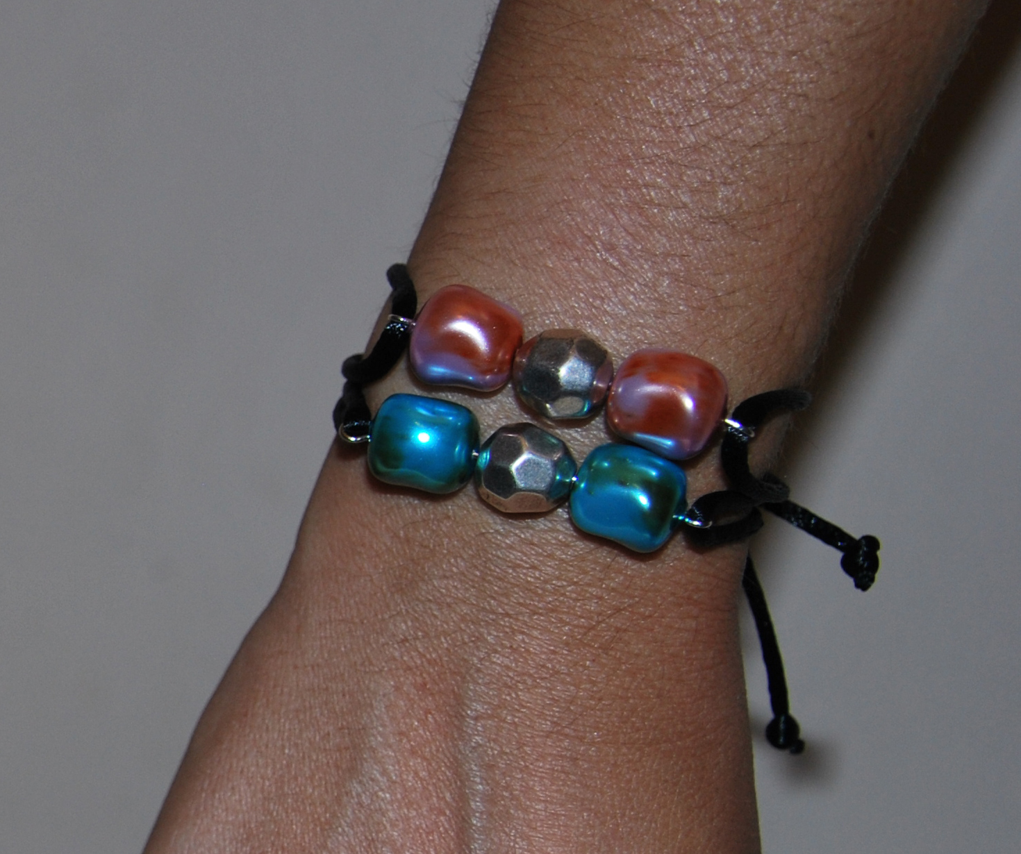 Delicadas pulseras realizadas con cola de ratón negra y adornadas con tres perlas acrílicas, dos de color azul o rosa y una plateada.