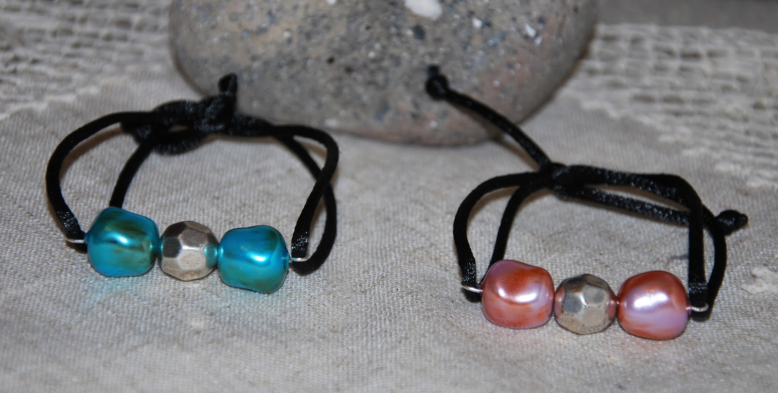 Delicadas pulseras realizadas con cola de ratón negra y adornadas con tres perlas acrílicas, dos de color azul o rosa y una plateada.
