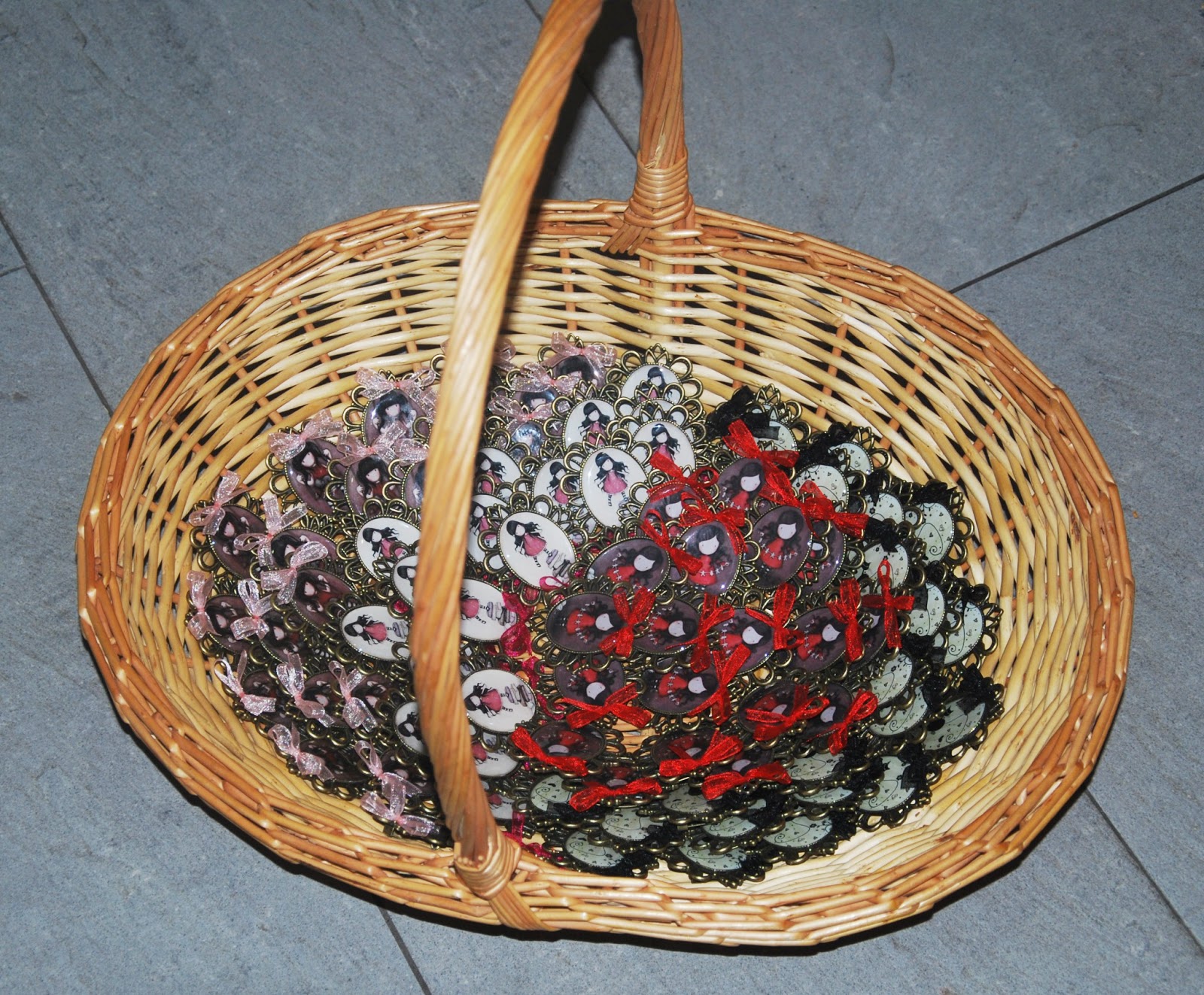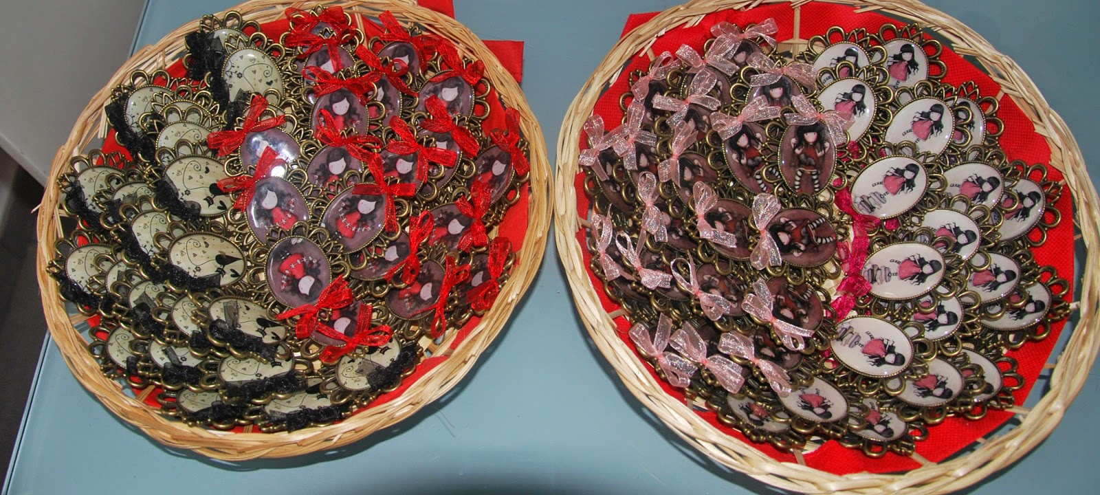 Son broches de gran tamaño (la imagen mide 40x30 mm). Y nos pidió 4 modelos diferentes que podéis ver divididos en estas dos cestitas. Cada broche, lleva un pequeño lacito a juego.